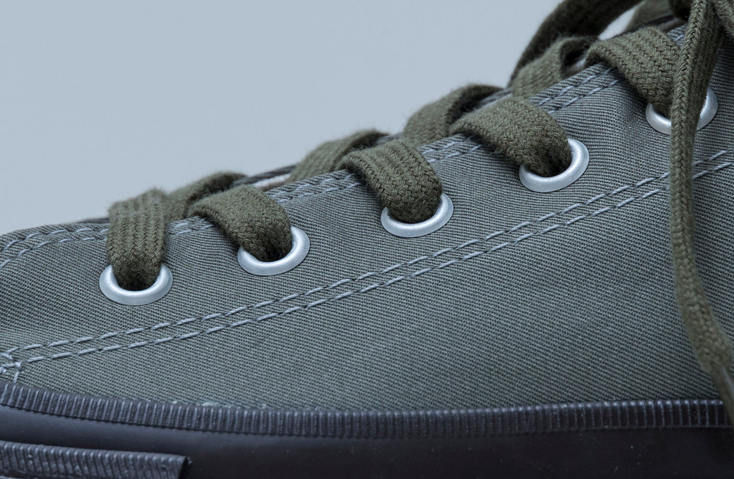 キャンバススニーカーの発展はバスケットボールというスポーツと共にあったと言っても過言ではありません。50~60年代にはこぞってアメリカのプロ選手がキャンバススニーカーを履き、現在のような機能的なデザインが追求されました。<DOEK BASKET>は外羽根式のバスケットシューズのデザインを採用。特定の主張となるようなものを排し、素材とそれらを最大限生かすことだけを考えました。アッパーには国産ギャバジン生地の「NEW CHAMOIS(ニューセーム)」を採用。非常になめらかで程よい光沢のある質感は、平織りのキャンバスとはまた異なる表情で、通年で着用しやすいのも魅力です。細番手の糸で高密度に打込んだギャバジン生地は、撥水性や耐久性に優れ、それでいてコットン100%なので、普段のケアも簡単です。フットベッドには、天然の通気性を持った素材であるコルクを、アウトソールには滑りにくい様、バスケットシューズ特有の意匠が施してあるものを採用しました。丹誠な手仕事によるヴァルカナイズ製法は、美しさ、履きやすさ、耐久性において、今の暮しに必要十分なプロダクトを生み出します。