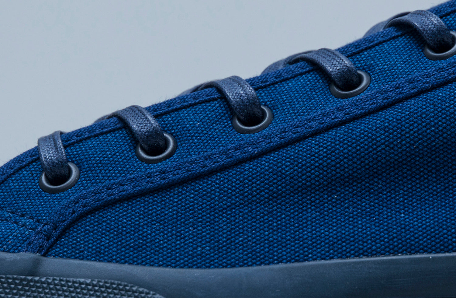 <DOEK COURT>は外羽根式のテニスシューズのデザインを踏襲、特定の主張となるようなものを排し、素材とそれらを最大限生かすことだけを考えました。アッパーのキャンバスには、旧式の力織機で織った10oz相当の目の粗いオリジナルのものを。糸から藍染めした<INDIGO/INDIGO>は履き込むほどに生地の表情が育ってきます。フットベッドには、天然の通気性を持った素材であるコルクを採用しました。丹誠な手仕事によるヴァルカナイズ製法は、美しさ、履きやすさ、耐久性において、いまの暮しに必要十分なプロダクトを生み出します。