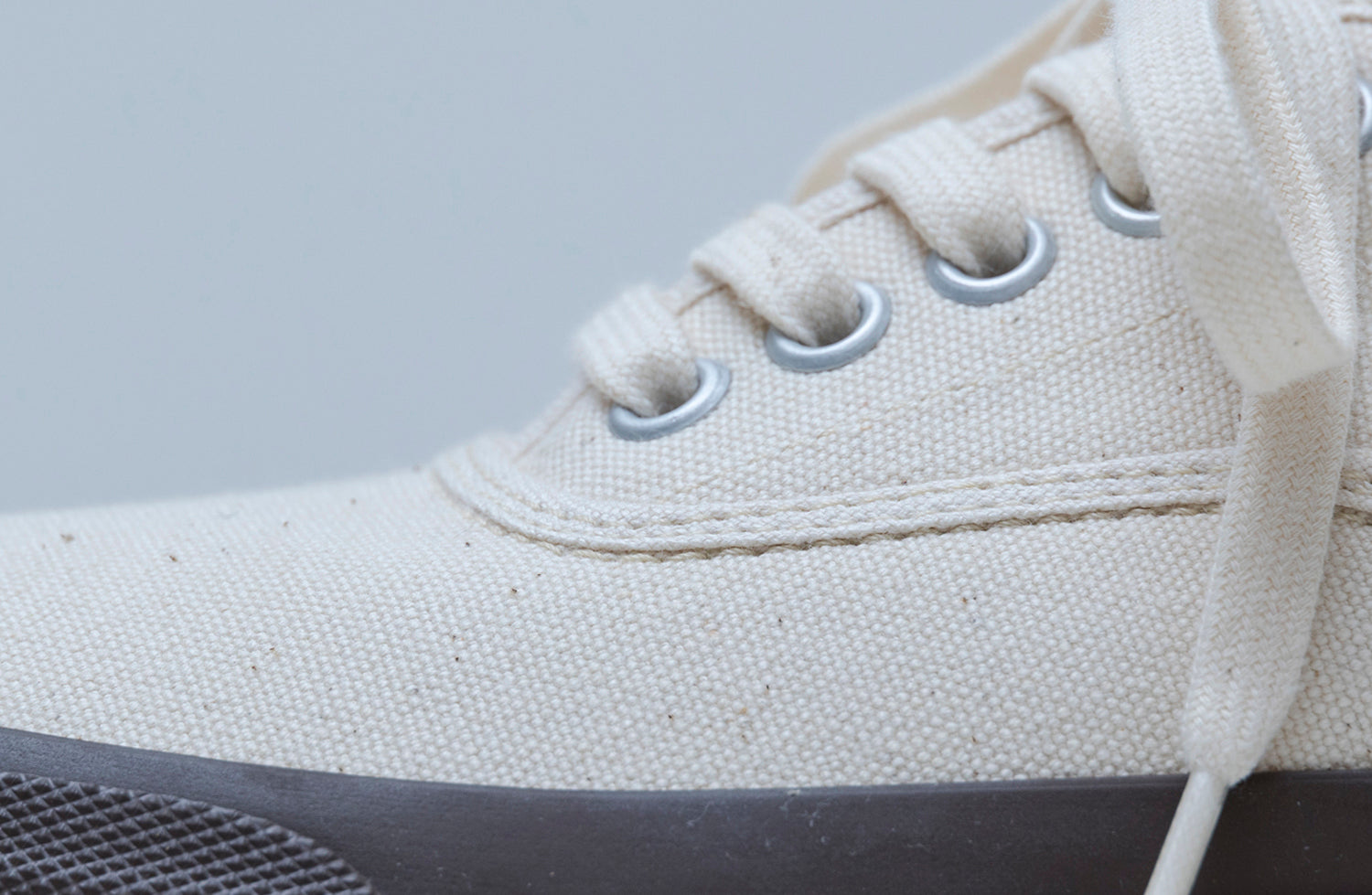 <DOEK OXFORD>は内羽根式のテニスシューズのデザインを踏襲、特定の主張となるようなものを排し、素材とそれらを最大限生かすことだけを考えました。アッパーのキャンバスには、旧式の力織機で織った10oz相当の目の粗いオリジナルのものを。生成りは染めていないため、生地が痩せることなく生地本来の風合いを存分に味わえます。フットベッドには、天然の通気性を持った素材であるコルクを採用しました。丹誠な手仕事によるヴァルカナイズ製法は、美しさ、履きやすさ、耐久性において、今の暮しに必要十分なプロダクトを生み出します。
