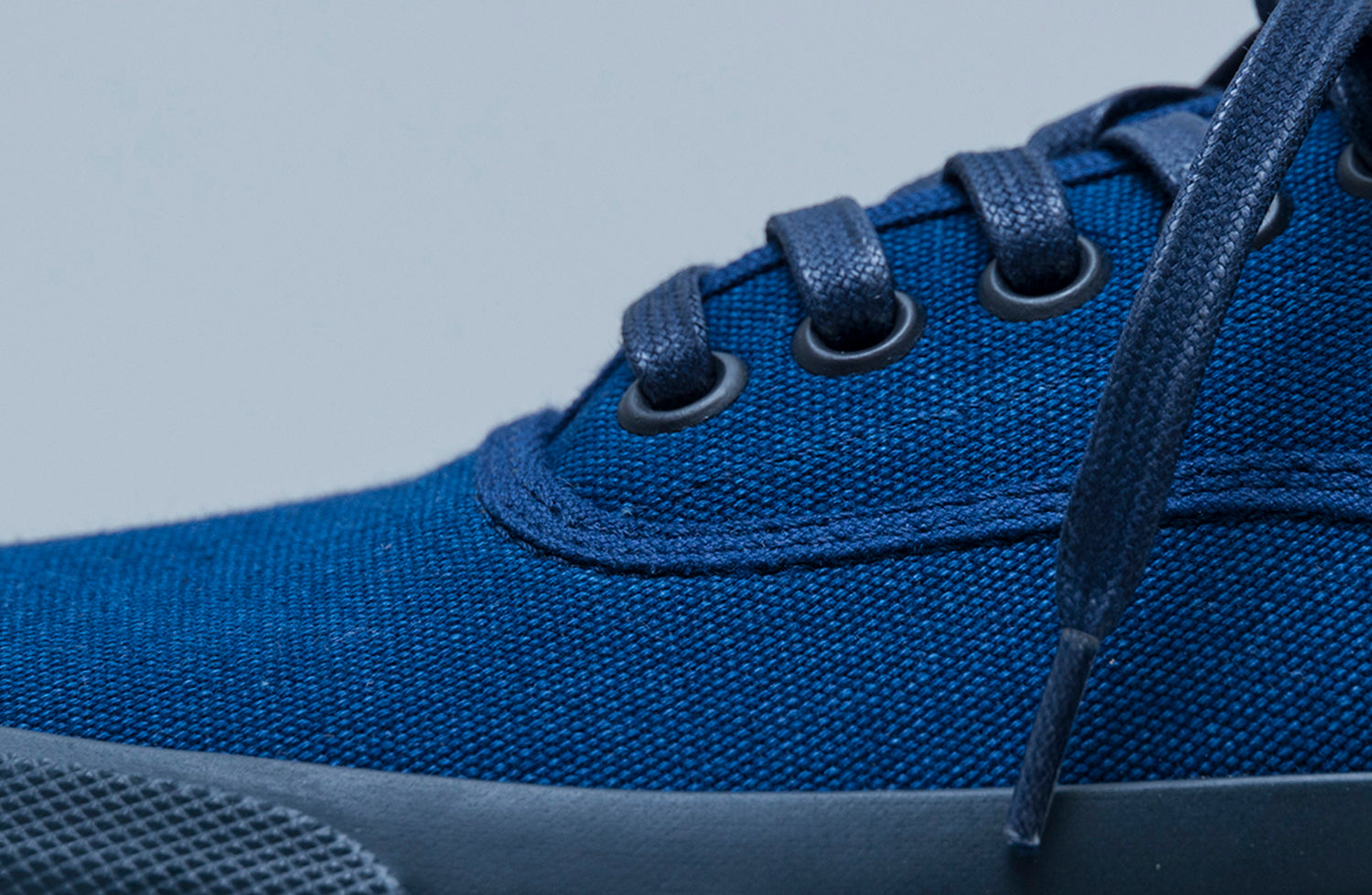 <DOEK OXFORD>は内羽根式のテニスシューズのデザインを踏襲、特定の主張となるようなものを排し、素材とそれらを最大限生かすことだけを考えました。アッパーのキャンバスには、旧式の力織機で織った10oz相当の目の粗いオリジナルのものを。糸から藍染めした<INDIGO/INDIGO>は履き込むほどに生地の表情が育ってきます。フットベッドには、天然の通気性を持った素材であるコルクを採用しました。丹誠な手仕事によるヴァルカナイズ製法は、美しさ、履きやすさ、耐久性において、いまの暮しに必要十分なプロダクトを生み出します。