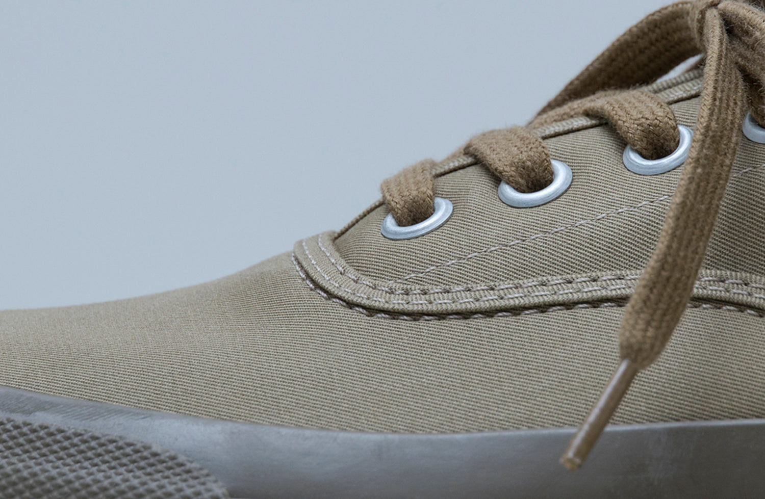 <DOEK OXFORD>は内羽根式のテニスシューズのデザインを踏襲、特定の主張となるようなものを排し、素材とそれらを最大限生かすことだけを考えました。アッパーには国産ギャバジン生地の「NEW CHAMOIS(ニューセーム)」を採用。非常になめらかで程よい光沢のある質感は、平織りのキャンバスとはまた異なる表情で、通年で着用しやすいのも魅力です。細番手の糸で高密度に打込んだギャバジン生地は、撥水性や耐久性に優れ、それでいてコットン100%なので、普段のケアも簡単です。フットベッドには、天然の通気性を持った素材であるコルクを採用しました。丹誠な手仕事によるヴァルカナイズ製法は、美しさ、履きやすさ、耐久性において、今の暮しに必要十分なプロダクトを生み出します。
